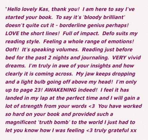 "Kas isn't just a writer, she's a therapist disguised as a truth-teller, disguised as a rebel poet. She writes with the accuracy of someone who has lived it all and because I know her. I know it's all true. Kas teaches without preaching, delivers psycho-education seamlessly in raw storytelling so that you learn without even realising you're soaking it all up. Then your body shakes the trauma free so your soul can finally sigh. She's magic."