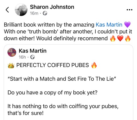 "This is clinical-level, soul-deep, trauma-informed, rebellion-fuelled liberation. WOW! I wish I had the guts to speak out like you Kas."