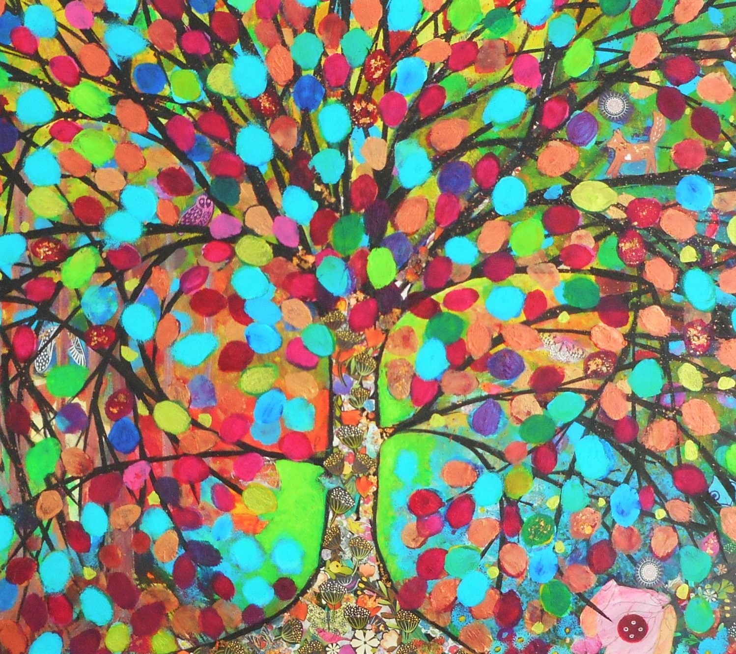 The Tree that is uppermost that you see on my Painting, is me today. My richly collaged Trunk, representing everything I bring to my work, life, relationships... I gazed in and felt proud. I stood tall and grateful at all that my Tree was teaching me.